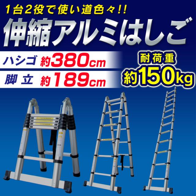 はしご 伸縮 脚立 アルミ ハシゴ 伸縮はしご 3.8m 折りたたみ 安全ロック付き アルミはしご 頑丈 梯子 足場 踏み台 踏台 スーパーラダー 丈夫 折り畳み 掃除 雪おろし 雪 屋根 剪定 ガーデニング 洗車 送料無料