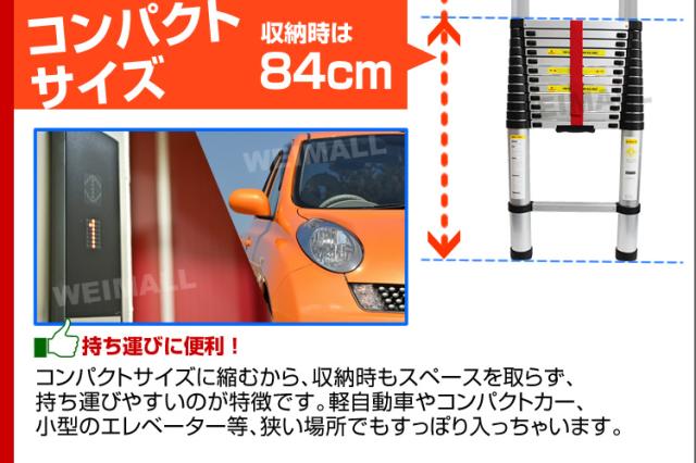伸ばせば最長3.8m (373cm) アルミ製伸縮ハシゴです。