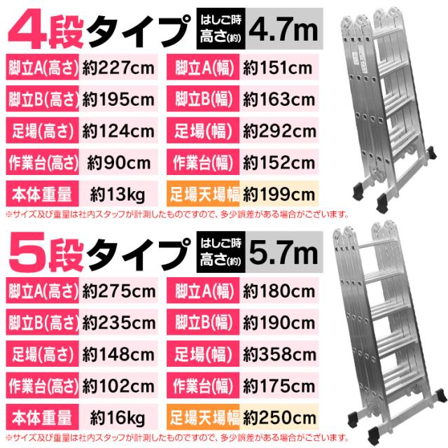 | サイズ | ・折り畳み時:(約)幅38cm×奥行き28cm×高さ123cm ・ハシゴ時:(約)高さ470cm ・脚立時:(約)高さ227cm ・足場時:(約)幅292cm×高さ124cm |