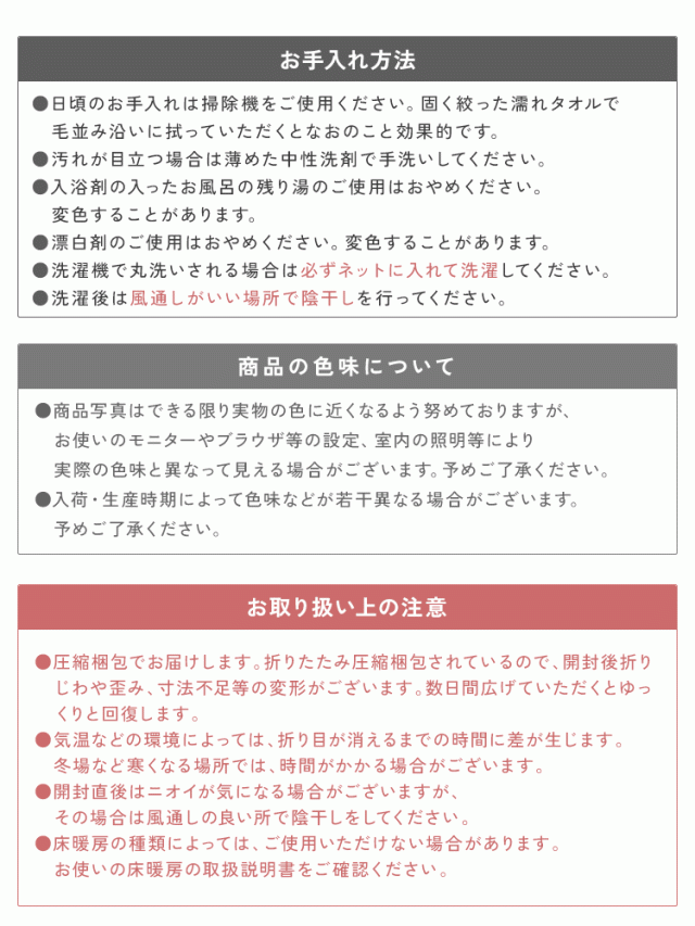 | 注意事項 | ・開封後は新品の為においのする場合がございます。こちらのにおいは、時間の経過により消えていきますのでご安心下さい。もし、気になるようでございましたら その場合は、日の当たる場所に干すなどしていただきますようお願い致します。 ・洗濯の際は必ず、ネットに入れて下さい。 ・日常的に掃除機でのお掃除をオススメ致します。 ・商品は、モニターによって色合いが異なって見える場合があります。 ・仕様・デザインは改良のため予告なく変更することがあります。 |