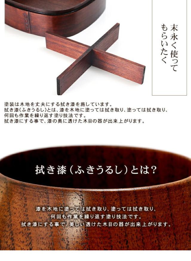 | お正月や運動会だけじゃなくホームパーティや家族のお出かけにも。使う日が楽しみになる。おしゃれな曲げわっぱの重箱は、料理も映えみんなに褒められるほど。重箱があるだけで華やかさを演出できます。盛り付けの手助けになる、取り外し可能な仕切りも2段分付属しています。シンプルなナチュラルな雰囲気がカジュアルな席にもオススメです。おにぎりやおかずを詰めて、ピクニックや行楽に。お正月や運動会、お花見など一年中活躍します。友だちにも自慢したくなる、木の優しい手触り、見た目が魅力です。塗装は木地を丈夫にする拭き漆を施しています。拭き漆(ふきうるし)とは、漆を木地に塗っては拭き取り、塗っては拭き取り、何回も作業を繰り返す塗り技法です。拭き漆にする事で、漆の奥に透けた木目の器が出来上がります。 |