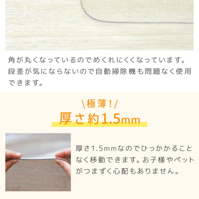 - キャスター付きテレビ台の為に購入しました。 透明なので悪目立ちすることもなく、適度な厚みがあるので床の傷防止にもしっかり役立ってくれそうです。 まるまり癖が抜けるのには少し時間がかかりますが許容範囲か...