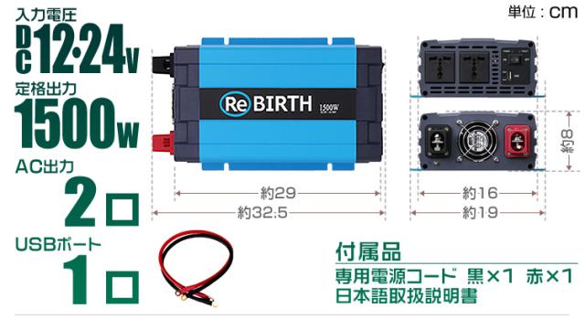 | 仕様 | 入力電圧:DC24V 出力電圧:AC100V 定格出力:1500W 出力周波数:50Hz/60Hz切替 出力仕様:ACコンセント(2口)、USBポート(1口) 出力波形:正弦波 USB出力:DC5.1V/1.0A 使用温度環境:0℃〜40℃ 本体サイズ(約):350mm×190mm×80mm 重量(約):2.3kg |