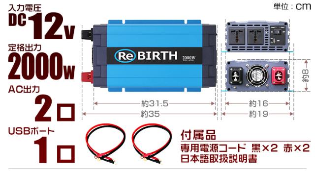 | 仕様 | 入力電圧:DC12V 出力電圧:AC100V 定格出力:2000W 出力周波数:50Hz/60Hz切替 出力仕様:ACコンセント(2口)、USBポート(1口) 出力波形:正弦波 USB出力:DC5.1V/1.0A 使用温度環境:0℃〜40℃ 本体サイズ(約):350mm×190mm×80mm 重量(約):2.6kg |