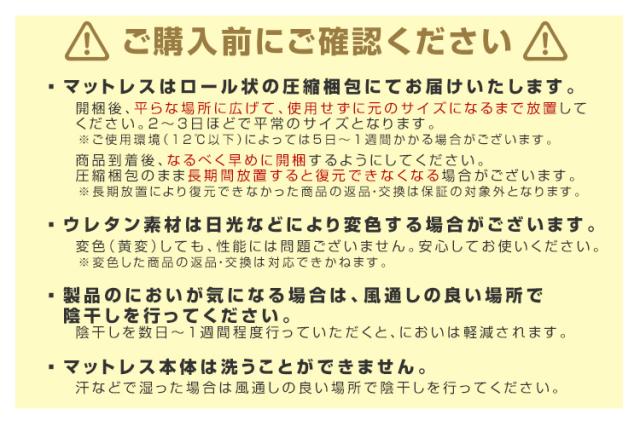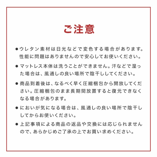 | 注意事項 | ・圧縮梱包されたままの状態で長期間保管した場合、マットレスが復元できなくなってしまいます。商品到着後、すぐ圧縮から開放をして頂くようにお願いいたします。 ・マットレスは約2-3日程度で復元します。ご使用環境により5日-1週間程度かかる場合がございます。 ・製品の臭いが気になりましたら、風通しの良いところで脱臭してください。この臭いは素材のウレタンによるもので無害です。臭いに敏感な方は十分ご検討の上、ご購入をお願いいたします。 ・マットの硬さは温度によって変わってきます。また、硬さの感じ方には個人差があります。 ・カバーは取り外して洗濯ができますが、マットレス本体は洗濯しないでください。 ・商品は、モニターによって色合いが異なって見える場合があります。 ・仕様・デザインは改良のため予告なく変更することがあります。 |