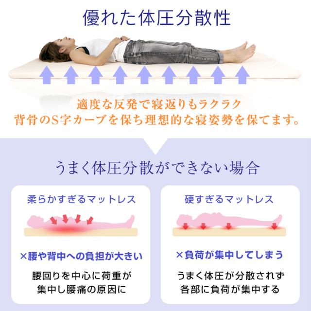 柔らかいマットレスとは違い、身体の沈み込みを軽減した腰に優しい寝心地です。