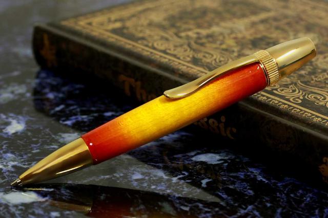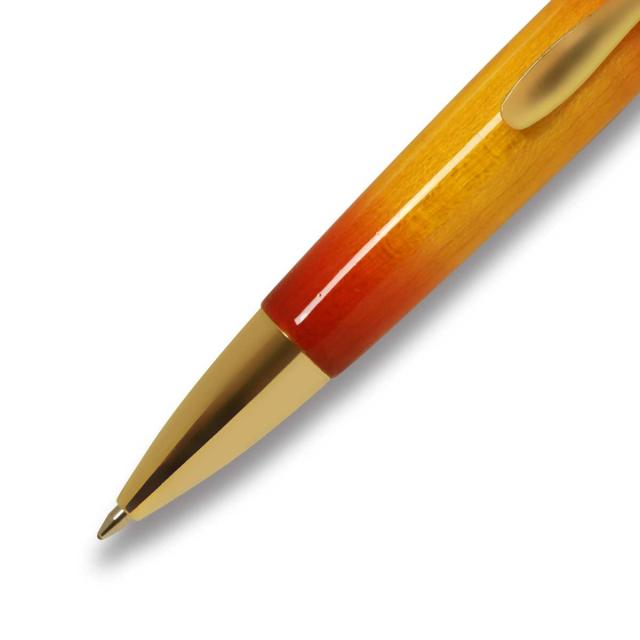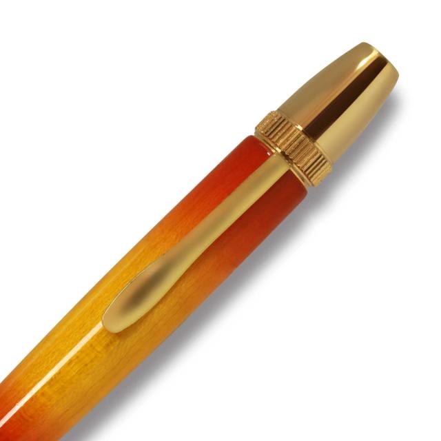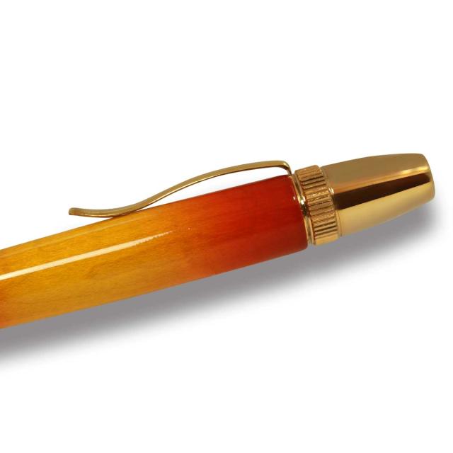 楽器のようなボールペン。高級ギターやバイオリンに使われる加工技術を天然木にエアーブラシ・ウレタン塗装で吹きつけ、限りなく再現いたしました。音楽好きの方にはたまらない一品です。一本一本、丁寧かつ丹念に塗装。木目が透けて見えるかのようなグラデーション調の美麗なボディ塗装。天然木に、ウレタンクリア塗装をエアブラシで吹き付け、鮮やかな色彩と艶、なめらかな質感を表現しました。