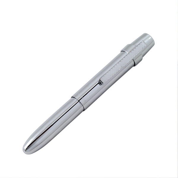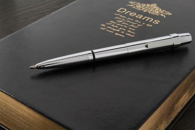 従来のボールペンは重力でインクがボールの先へと流れていきますが、フィッシャースペースペンではリフィル内部に封入された窒素ガスの圧力によってインクがボールの先へ移っていきます。そのため上向きにして筆記することが可能で、無重力状態、水中やマイナス45℃から200℃までの気温においてもスムーズに筆記することが可能です。