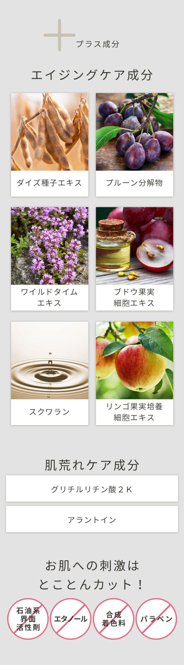 水、スクワラン、ハイドロキノン、(アクリル酸ヒドロキシエチル/アクリロイルジメチルタウリンNa)コポリマー、ステアリン酸グリセリル、1,2−ヘキサンジオール、グリセリン、テトラヘキシルデカン酸アスコルビル、カルボキシメチル−β−グルカンNa、リンゴ果実培養細胞エキス、アラントイン、グリチルリチン酸2K、ダイズ種子エキス、ワイルドタイムエキス、プルーン分解物、BG、レシチン、乳酸Na、乳酸、キサンタンガム、ピロ亜硫酸Na、エチドロン酸
