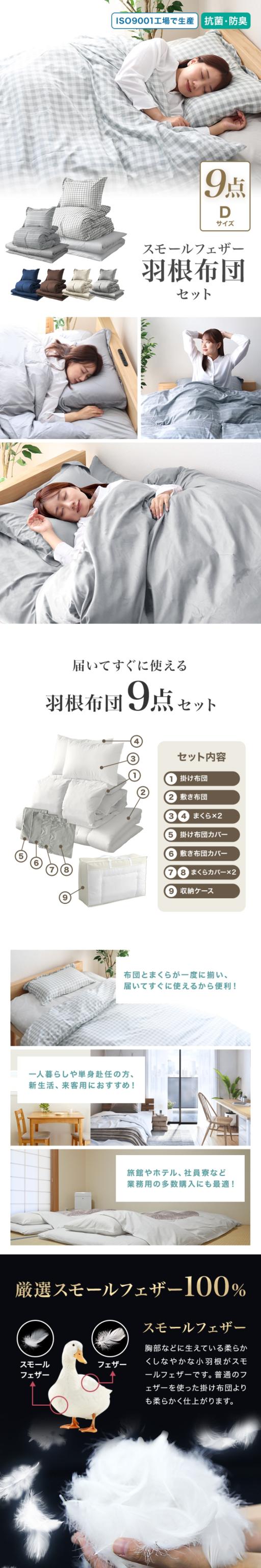 | 内容 | 羽根布団9点セット ・掛け布団 ・敷き布団 ・まくら×2 ・掛け布団カバー ・敷き布団カバー ・まくらカバー×2 ・収納ケース |