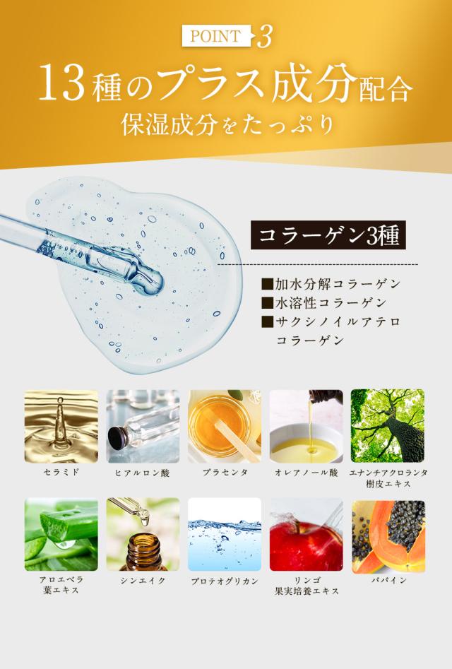 水, DPG, ベンチレングリコール, グリセリン, 温泉水, パルミチン酸アスコルビルリン酸3Na, セレブロシド, リン酸アスコルビルMg, アスコルビルグルコシド, ヒアルン酸Na, 加水分解コラーゲン, 水溶性コラーゲン, サクシノイルアテロコラーゲン, アロエベラ葉エキス, α-アルブチン, アスタキサンチン, リンゴ果実培養細胞エキス, プラセンタエキス, 水溶性プロテオグリカン, エナンチアクロランタ樹皮エキス, オレアノール酸, パパイン, パルミトイルペンタペプチド-4, アセチルヘキサペプチド-8, ジ酢酸ジペプチドジアミノブチロイルベンジルアミド, パルミトイルテトラペプチド-7, パルミトイルトリペプチド-1, クリシン, N-ヒドロキシコハク酸イミド, BG, エタノール, トリ(カプリル酸/カプリン酸)グリセリル, デキストリン, レシチン, ラウリン酸ポリグリセリル-10, PEG-20ソルビタンココエート, ポリソルベ-ト20, ステアレス-20, キサンタンガム, カルボマー, クエン酸, クエン酸Na, フェノキシエタノール