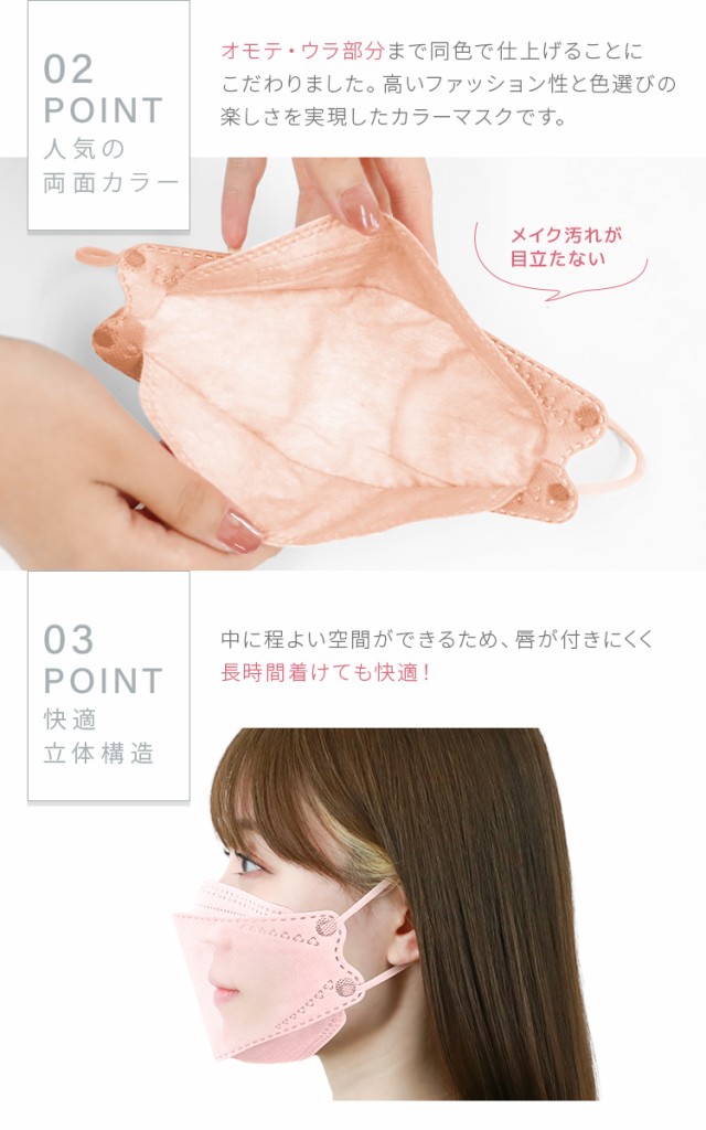 | 特徴 | 選べるカラー 3D立体デザイン 99%カット高密度フィルター 特注仕様両面同色 平ゴム採用 4層構造 5枚ずつ袋入り 小顔効果 風邪予防 飛沫対策 花粉対策 PM2.5対策 ウイルス飛沫対策 ハウスダスト対策 |