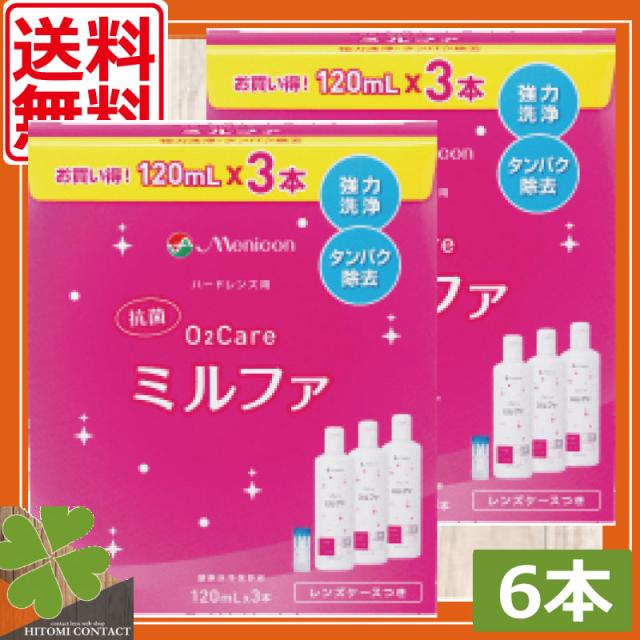 送料無料 メニコン 抗菌O2ケアミルファ(120ml×3本+ケース付)×2箱 ハード O2レンズ