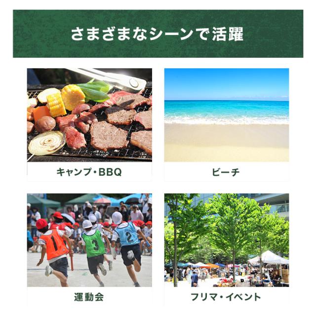 急な雨が降っても安心の撥水加工が施されており、大人数のバーベキューやスポーツ観戦、アウトドア、休憩所にぴったり。