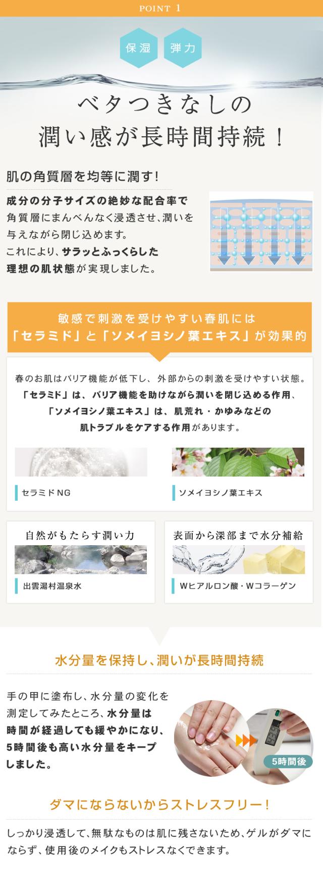 水、BG、グリセリン、パルミチン酸エチルヘキシル、メチルグルセス−10、ベタイン、DPG、セラミドNG、ソメイヨシノ葉エキス、温泉水、ヒアルロン酸Na、加水分解ヒアルロン酸、水溶性コラーゲン、加水分解コラーゲン、白金、プラセンタエキス、α−アルブチン、ダイズ種子エキス、モモ葉エキス、アラントイン、トコフェロール、マンニトール、炭酸水素Na、銀、オレンジ油、ラベンダー油、リナロール、ゲラニオール、結晶セルロース、グリチルリチン酸2K、ユビキノン、カルボマー、セルロースガム、水酸化K、ヒドロキシプロピルメチルセルロース、酸化鉄、メチルパラベン