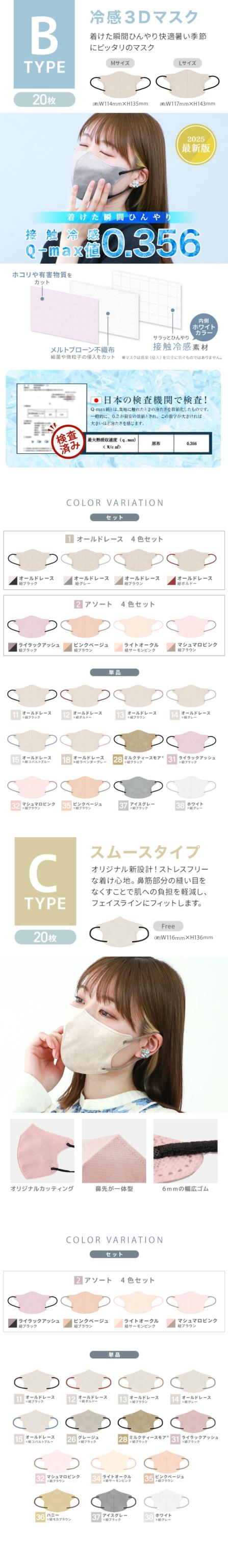 | タイプ | Aタイプ:3D立体 オリジナル立体構造で程よい空間を保ちつつフェイスラインに隙間なくフィット Bタイプ:冷感3D立体 付けた瞬間にひんやり快適暑い季節にピッタリのマスク Cタイプ:スムースタイプ 鼻への摩擦を減らしストレスフリーな着け心地 Dタイプ:ワイヤーフィット 新設計のワイヤー入りで快適さとフィット感が抜群 |