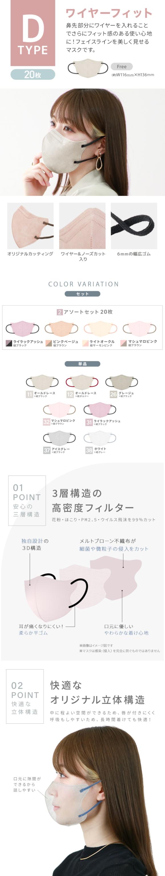 | タイプ | Aタイプ:3D立体 オリジナル立体構造で程よい空間を保ちつつフェイスラインに隙間なくフィット Bタイプ:冷感3D立体 付けた瞬間にひんやり快適暑い季節にピッタリのマスク Cタイプ:スムースタイプ 鼻への摩擦を減らしストレスフリーな着け心地 Dタイプ:ワイヤーフィット 新設計のワイヤー入りで快適さとフィット感が抜群 |