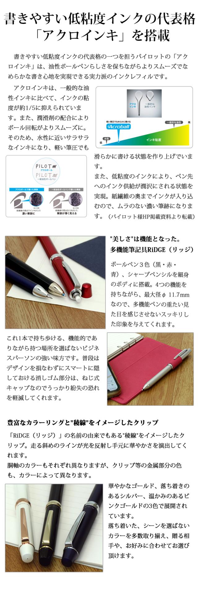 国内最大の筆記具ブランドPILOT(パイロット)の多機能ペン「スリープラスワン リッジ」。10色から選べます。これ1本で持ち歩ける、最前線で頑張るビジネスマンにピッタリの、贈って喜ばれる多機能ペンです。