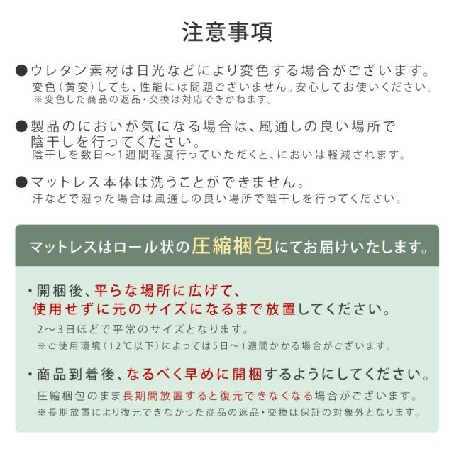 | 注意事項 | ・圧縮梱包されたままの状態で長期間保管した場合、マットレスが復元できなくなってしまいます。商品到着後、すぐ圧縮から開放をして頂くようにお願いいたします。 ・マットレスは約2〜3日程度で復元します。ご使用環境により5日〜1週間程度かかる場合がございます。 ・製品の臭いが気になりましたら、風通しの良いところで脱臭してください。この臭いは素材のウレタンによるもので無害です。臭いに敏感な方は十分ご検討の上、ご購入をお願いいたします。 ・マットの硬さは温度によって変わってきます。また、硬さの感じ方には個人差があります。 ・カバーは取り外して洗濯ができますが、マットレス本体は洗濯しないでください。 ・商品は、モニターによって色合いが異なって見える場合があります。 ・仕様・デザインは改良のため予告なく変更することがあります。 |