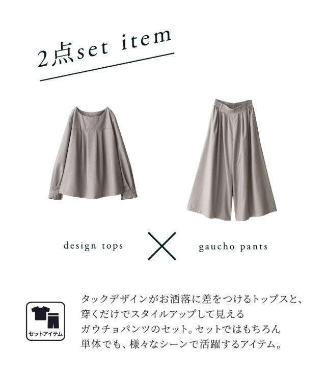 タックデザインが印象的な、トップス&ガウチョパンツのセットアップ♪ 胸元と袖口のタックが立体的なデザインのトップスと、足首の見える丈感&ボリュームが出すぎないよう細かくタックを入れたガウチョパンツがスタイルアップを叶えてくれる。 さらっとした軽い着心地で、ハリのある素材だから、着るだけできちんと感のある印象に。 単体でも着回し可能で、さらにM〜3Lサイズ展開が嬉しいポイントです♪ |