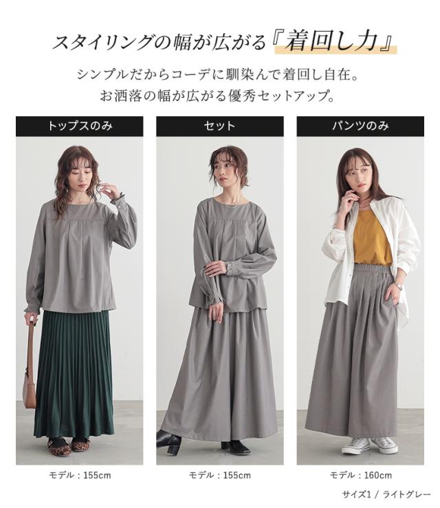 | staff:N/162cm 【普段着用】 トップス: S/M ボトムス: M | 【1(M〜L)】 トップス ◆袖丈:手首が隠れる位 ◆着丈:ヒップ真ん中位 ボトムス ◆着丈:ウエストで穿いてかかと上10cm位、腰で穿いてくるぶしが隠れる位 【2(LL〜3L)】 トップス ◆袖丈:手の甲真ん中位 ◆着丈:ヒップ下位 ボトムス ◆着丈:腰で穿いてかかとが隠れる位 1(M〜L)は、上下ともに体に沿わず、程よいゆとりがありますが、縦のラインでスッキリとしたシルエットで着られました。トップスをインして着るのもオススメです♪2(LL〜3L)は、私には大きめのサイズ感で、パンツはウエストで留まらず丈が長くなるので、ヒールと合わせると安心です。私の場合は1(M〜L)を選びます。 |
