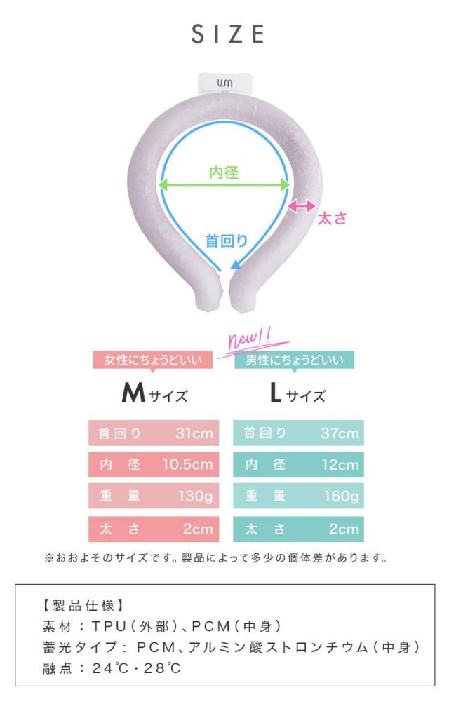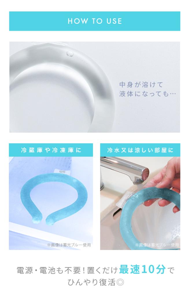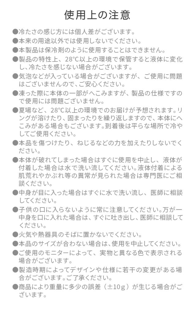 | 注意事項 | ・冷たさの感じ方には個人差がございます。 ・本製品は保冷剤のように使用することはできません。 ・凍り方や個体差によって色の出方が異なります。 ・凍った時に本体の一部がへこみますが、製品仕様となり使用には問題ございません。 ・本体が破けてしまった場合はすぐに使用を中止し、液体が付着した場合は水で洗い流してください。液体付着による肌荒れやかぶれ等の異常が見られた場合は専門医にご相談ください。 ・海外輸入品のため製品やパッケージに小さな傷や汚れ、へこみなどが見受けられる場合がございます。あらかじめご了承ください。 ・ご利用のモニターによって、実物と異なる色に表示される場合がございます。 ・製造時期によってデザインや仕様に若干の変更がある場合がございます。ご了承下さい。 ・製品の特性上、28℃以上の環境で保管すると液体に変化し、冷たさを感じない場合がございます。 ・夏場の運送時など、28℃以上の環境でのお届けが予想されます。リングが溶けたり、固まったりを繰り返しますので、リングにへこみのある物もございます。ご到着後は平らな所で冷やしてお使い下さい。 ・気泡などもご使用に問題はございませんので、ご安心ください。 ・商品により重量に多少の誤差(±10g)が生じる場合がございます。ご了承ください。 ・商品は、モニターによって色合いが異なって見える場合があります。 ・仕様・デザインは改良のため予告なく変更することがあります。 |