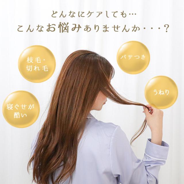 睡眠中の寝返りでシーツや枕カバーと擦れるたびに髪を傷つけ、潤い不足や切れ毛など様々なヘアトラブルをひき起こします。