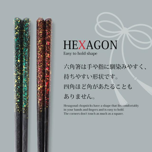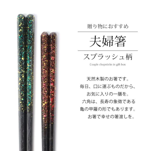 さらに、六角は、長寿の象徴である亀の甲羅の形でもあります。夫婦箸 お箸 ペア セット おしゃれ 結婚祝い 還暦祝い 両親 ギフトボックス入り 大人 プレゼント ギフト おはし スプラッシュ柄 送料無料