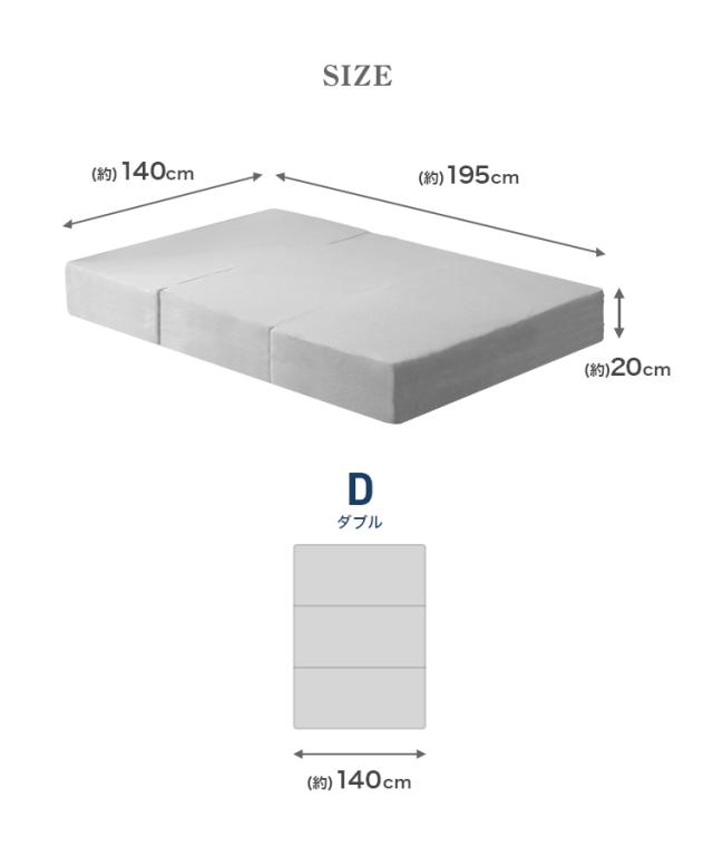 | サイズ | (約)幅140cm×長さ195cm×厚さ20cm(ダブルサイズ) ※折りたたみ時:(約)幅195cm×長さ65cm×厚さ60cm |