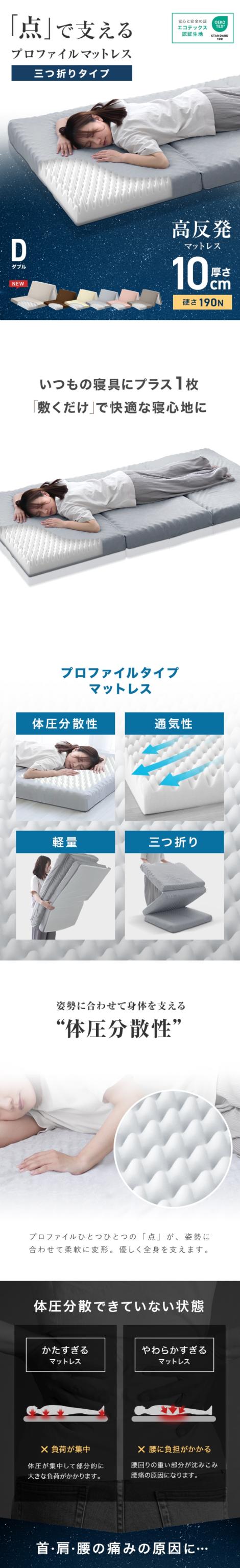 マットレス ダブル 三つ折り プロファイル 高反発 点で支える 190N 極厚 10cm 腰痛 改善 体圧分散 高品質 WEIMALL みつ折り 高反発マット 折り畳み マット ベッドマット ベッド 折りたたみ 布団 敷き布団 敷布団 寝具 新生活