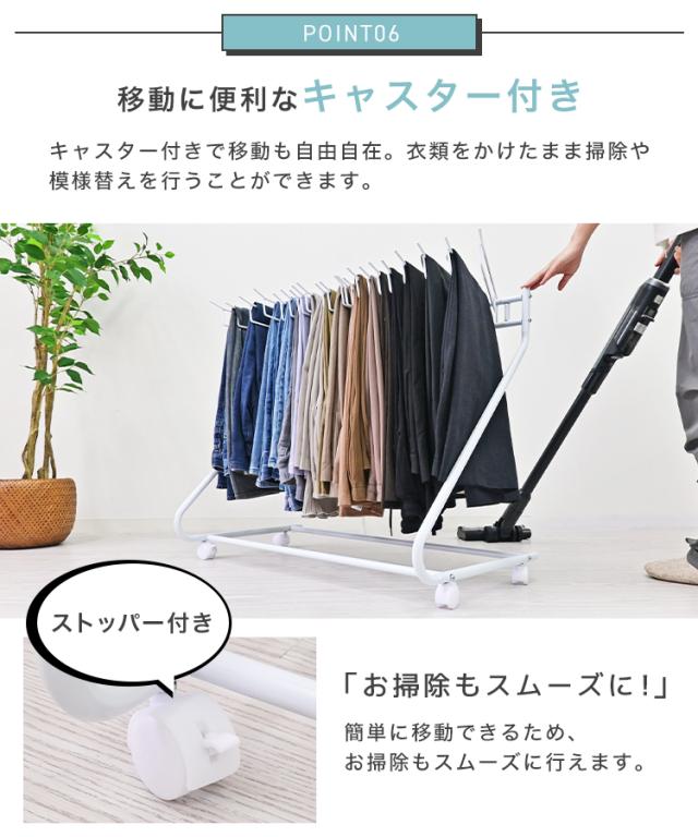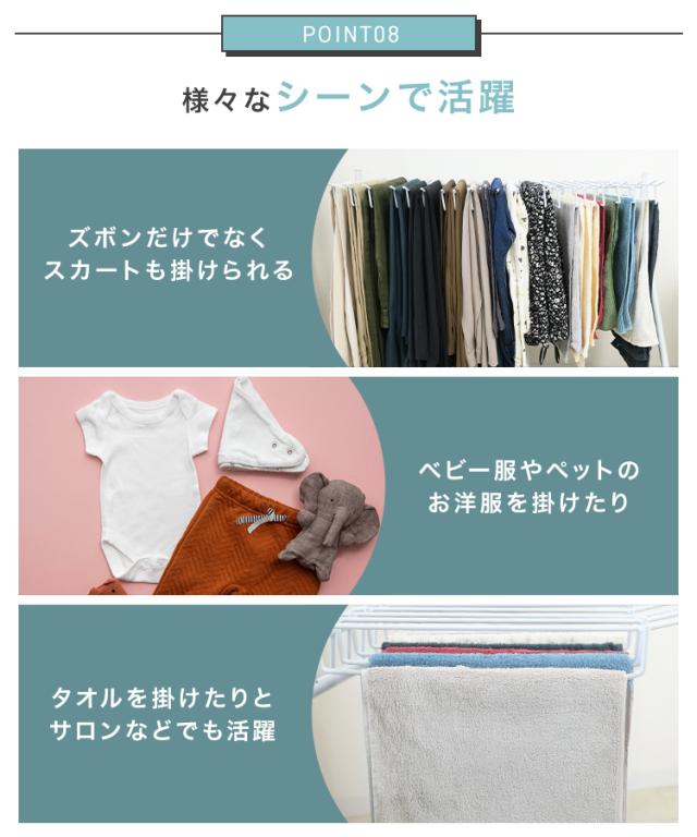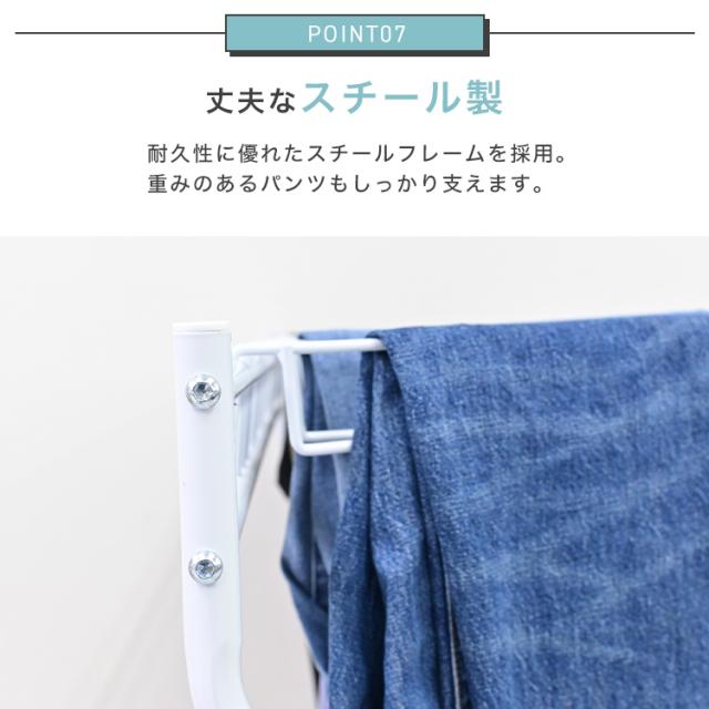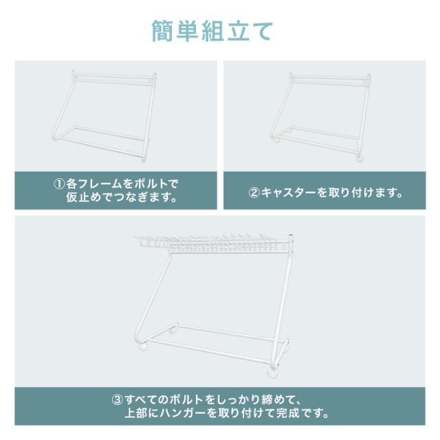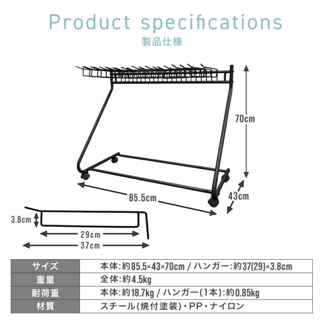 | 特徴 | 大容量ハンガー22本 キャスター付き 滑り落ち防止形状 スチール製で錆び汚れに強い |