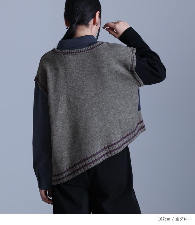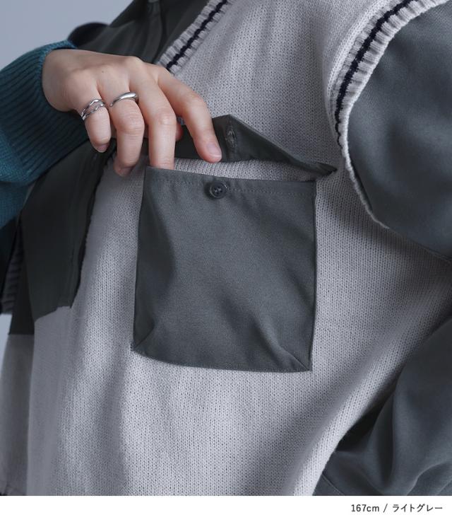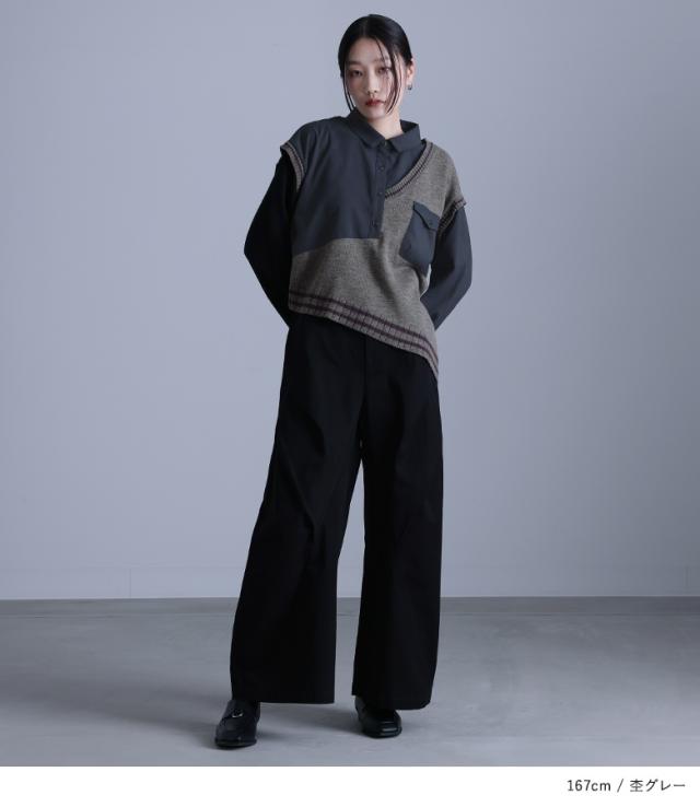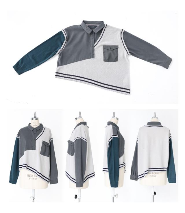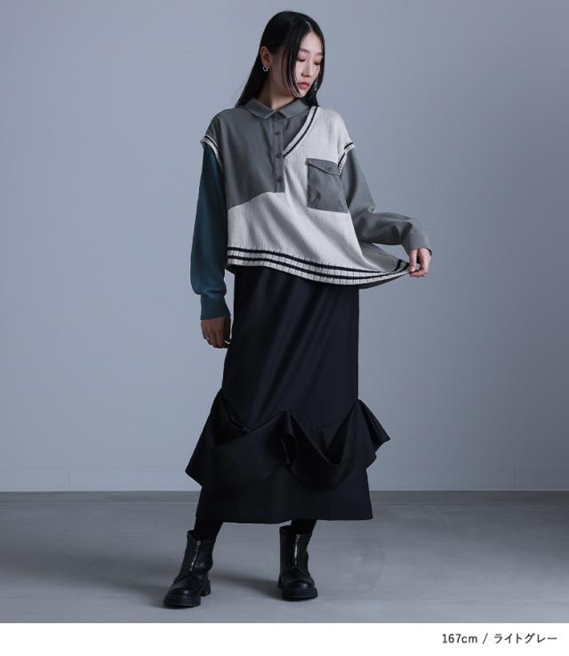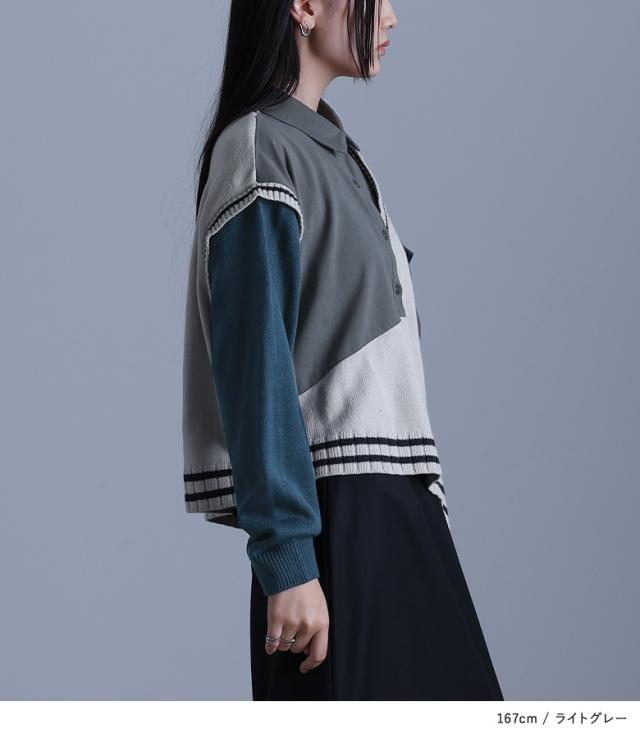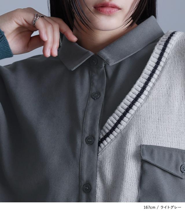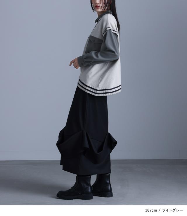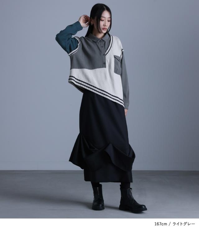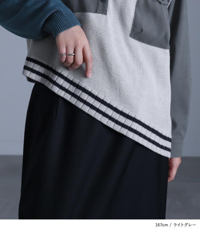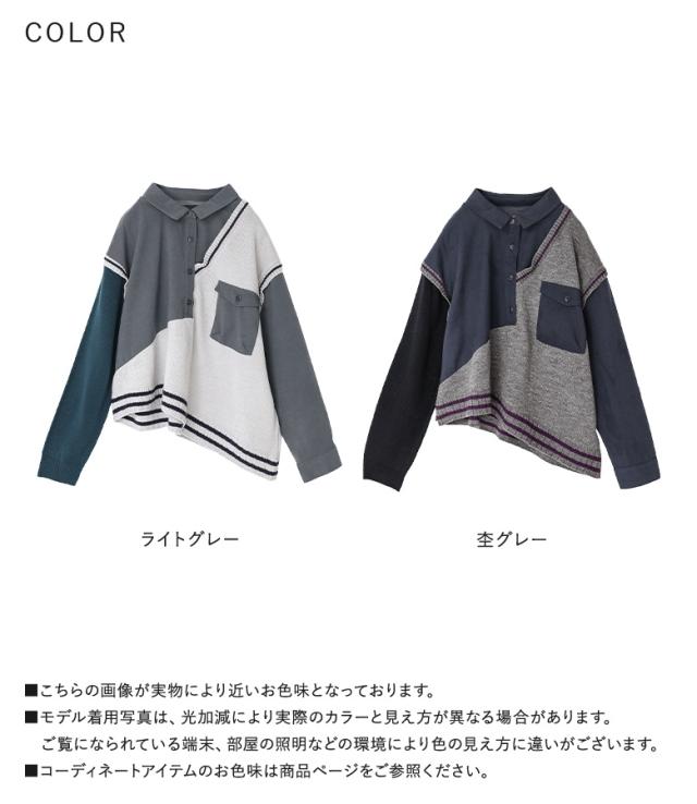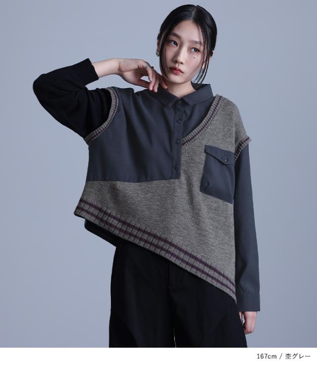 『シャツドッキングアシメニット』【メール便不可】【30】[トップス レディース ニット ニットトップス レディースニット 長袖 モード ドッキング 配色 アシンメトリー シャツ オシャレウォーカー]