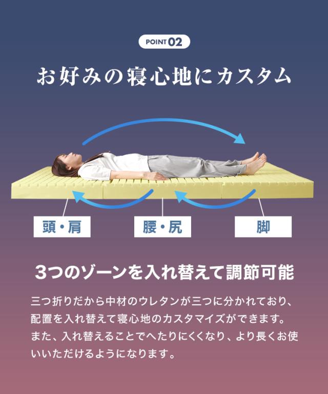 3つのゾーンで組み合わせが可能なので、負荷がかかりやすい腰回りだけ硬くすることもできます。