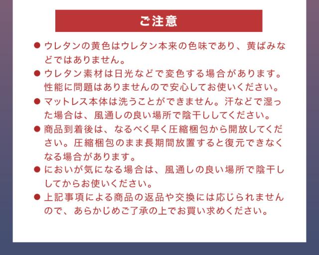・圧縮梱包されたままの状態で長期間保管した場合、マットレスが復元できなくなってしまいます。商品到着後、なるべく早めに圧縮梱包から解放してください。 ・環境によっては5-14日程度、復元に時間がかかる場合があります。 ・製造からお届けまでの期間が短いためウレタンのにおいを感じる場合がございます。製品のにおいが気になりましたら、風通しの良いところで脱臭してください。このにおいは素材のウレタンによるもので無害です。においに敏感な方は十分ご検討の上、ご購入をお願いいたします。 ・黄色はウレタン本来の色で黄ばみではありません。 ・ウレタン素材は日光などで変色する場合があります。 ・マットの硬さは温度によって変わってきます。また、硬さの感じ方には個人差があります。 ・マットレス本体は洗うことができません。汗などで湿った場合は、風通しの良い場所で陰干ししてからお使いください。 ・商品は、モニターによって色合いが異なって見える場合があります。 ・仕様・デザインは改良のため予告なく変更することがあります。 |