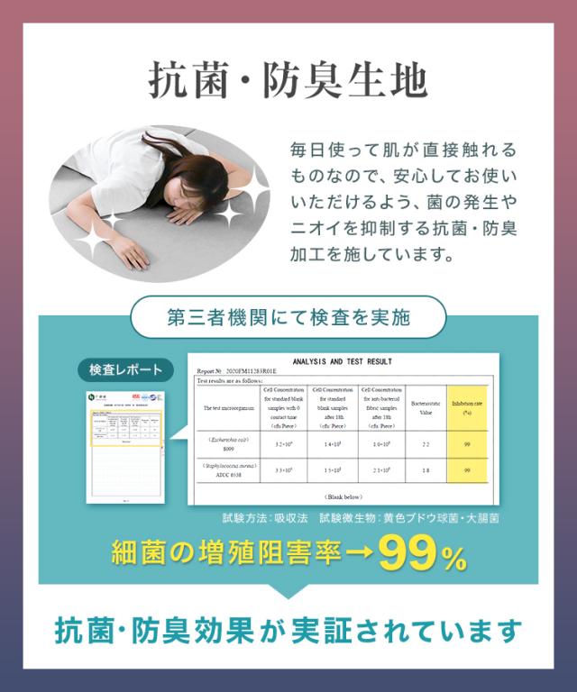 | 特徴 | 3層構造 硬さの違う3つのゾーン 3Dキューブ 高反発ウレタン エコテックス認証 抗菌防臭加工生地 洗えるカバー 着脱簡単U字ファスナー 持ち手付きカバー |