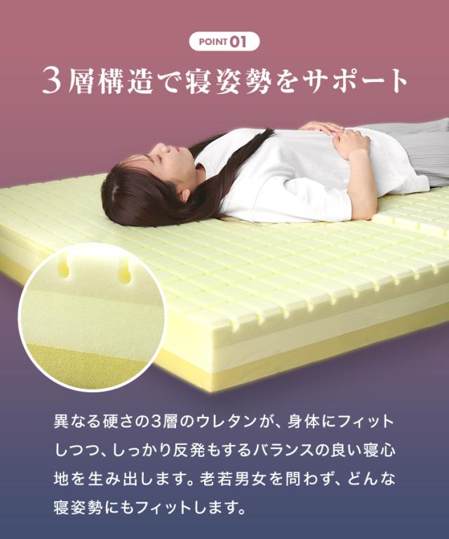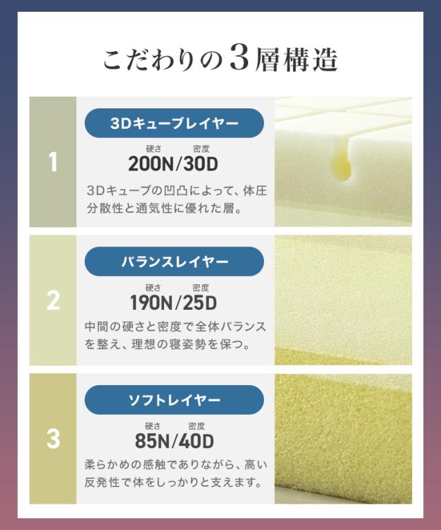 | 硬さ | キューブ高反発層:200N30D ミドル高反発層:190N25D フラット低反発層:85N40D |