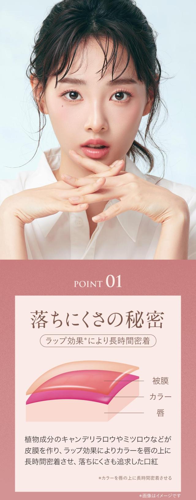 リンゴ酸ジイソステアリル・ジカプリン酸ネオペンチルグリコール・キャンデリラロウ・スクワラン・ミツロウ・ヒマシ油・ダイマージリノール酸(フィトステリル/イソステアリル/セチル/ステアリル/ベヘニル)・トリエチルヘキサノイン・アルガニアスピノサ核油・ザクロ種子油・ホホバ種子油・ヒマワリ種子油・ヒアルロン酸Na・アロエベラ葉エキス・クロレラエキス・クズ根エキス・トリイソステアリン酸ポリグリセリル−2・カルナウバロウ・トコフェロール・水・BG・フェノキシエタノール・(+/-)・マイカ・酸化チタン・酸化鉄・酸化スズ・ベニバナ赤・青1・赤104(1)・赤201・赤202・赤226・黄4・ホウケイ酸(Ca/Na)・結晶セルロース・硫酸Ba