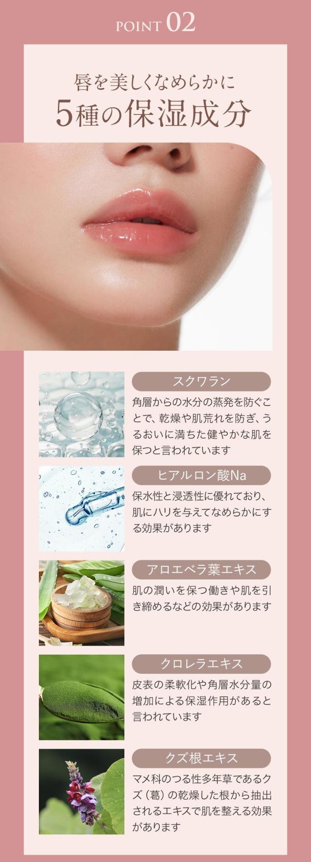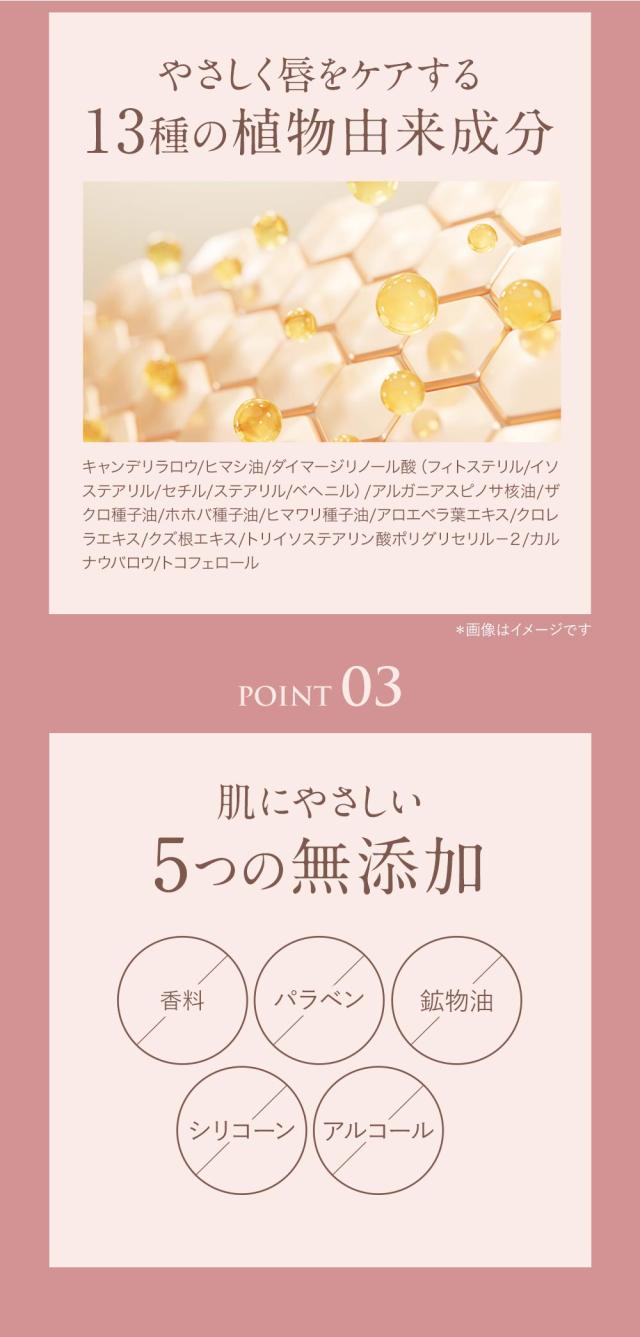 数種類の天然オイルをたっぷりと配合し、唇に潤いを与えぷっくりとさせます。