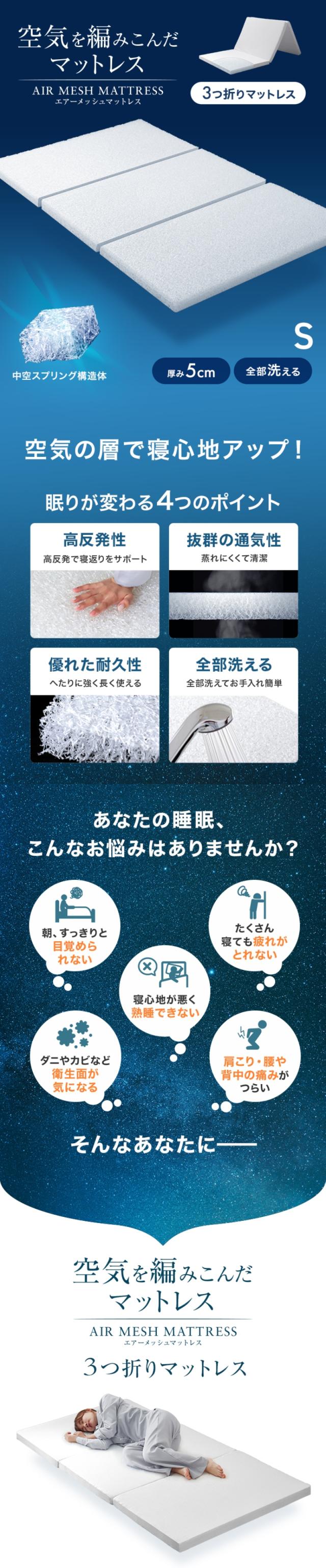 【空気を編みこんだ】 マットレス 三つ折り シングル 洗える マットレストッパー 厚さ5cm エアーメッシュ トッパー 折りたたみ 3D立体構造 通気性 高反発 敷布団 敷き布団 体圧分散 腰痛 マット 硬め 軽量 高反発マットレス メッシュマットレス 新生活 S