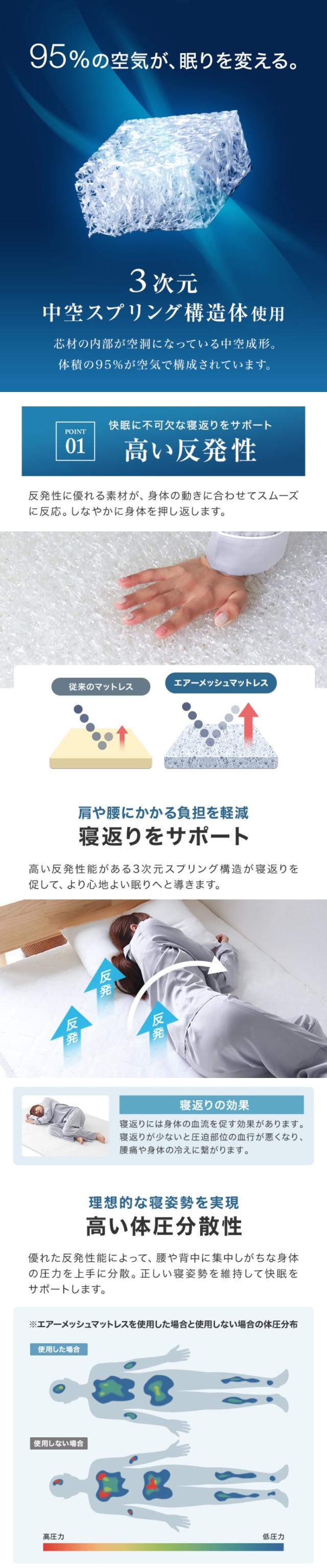 たっぷりの空気を含んだ3Dエアメッシュが理想的な寝姿を維持し、 快適な睡眠をサポートします。