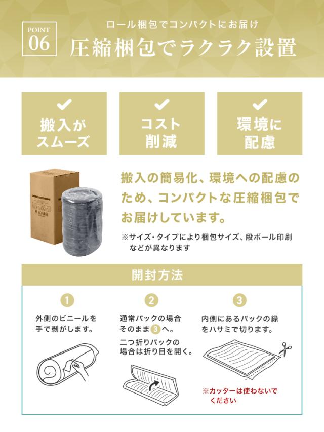 ・入荷時期により、キルティングラインの変更や同色の柄が入ることがあります。ご了承ください。 ・圧縮梱包されたままの状態で長期間保管した場合、マットレスが復元できなくなってしまいます。商品到着後、すぐ圧縮から開放をして頂くようにお願いいたします。 ・マットレスは約2〜3日程度で復元します。ご使用環境により5日〜1週間程度かかる場合がございます。 ・製品の臭いが気になりましたら、風通しの良いところで脱臭してください。この臭いは素材のウレタンによるもので無害です。臭いに敏感な方は十分ご検討の上、ご購入をお願いいたします。 ・マットの硬さは温度によって変わってきます。また、硬さの感じ方には個人差があります。 ・カバーは取り外して洗濯ができますが、マットレス本体は洗濯しないでください。 ・商品は、モニターによって色合いが異なって見える場合があります。 ・仕様・デザインは改良のため予告なく変更することがあります。 |