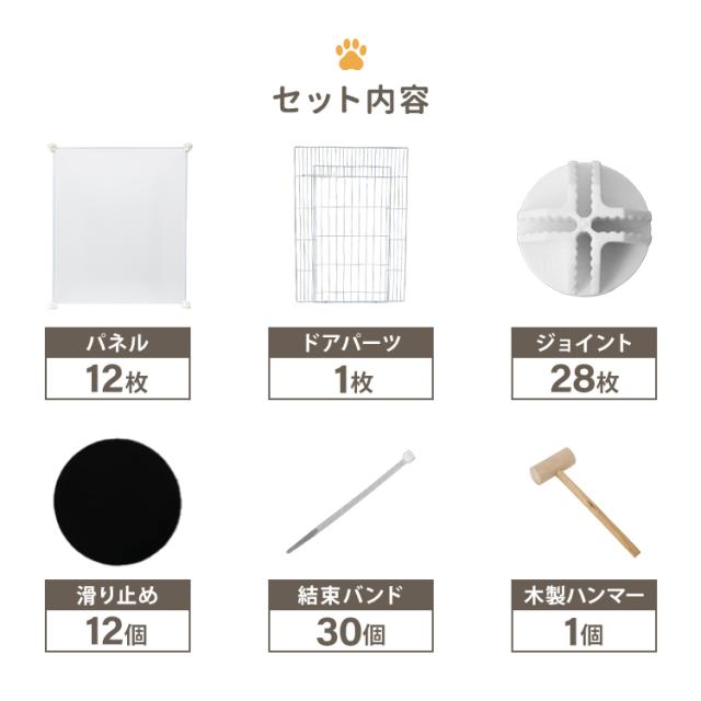 | 内容 | パネル×12枚 ドアパーツ×1枚 ジョイントパーツ×28個 滑り止め×12枚 結束バンド×30本 木製ハンマー×1個 |