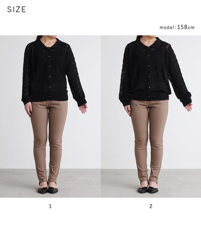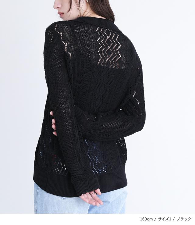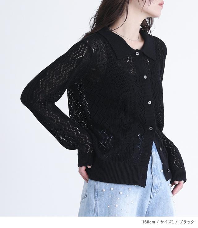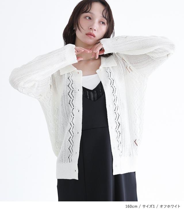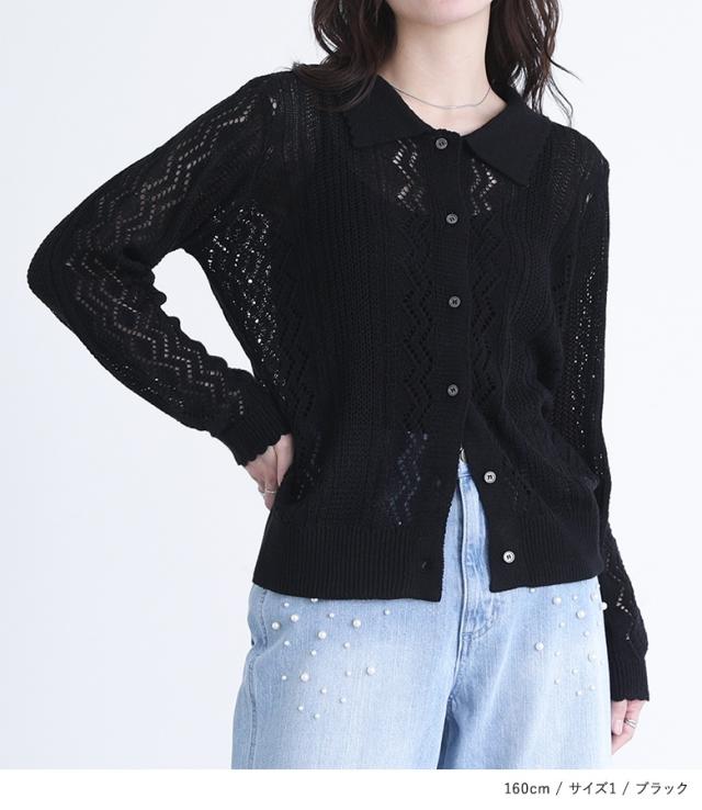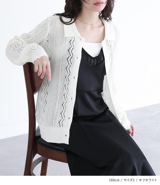 『透かし編みニットカーディガン』【メール便不可】【30】[カーディガン レディース トップス ニット 長袖 透かし編み 羽織 襟付き サマーニット 透け感 ニットシャツ 春 秋]