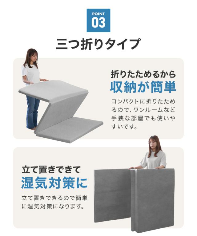 三つ折りタイプは、押入れなどに収納しやすく、立て掛けておいても場所をとりません。