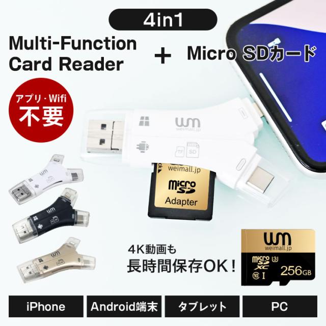 カードリーダー 4in1 microSDカードセット 256GB 専用アプリ不要 マルチカードリーダー SD スマホ 写真 動画 保存 移行 移動 データ バックアップ iPhone iPad Android Type-C Lightning タブレット USB USBメモリ 外付け 高速データ転送 送料無料