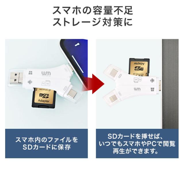カードリーダー スマホ SDカードリーダー microSD 携帯 スマホ 写真 カメラ USB USBメモリ メモリー ファイル データ 移行 移動 転送 整理 バックアップ 大容量 Type-C ハブ lightning ライトニング ワイファイ 不要 ワイヤレス iPhone 13 14 15 16 17 Android iPad PC Macbook SDカード 32GB 64GB 128GB 256GB TB microSDXC microSDHC 高速 転送速度 動画 音楽 写真整理 保存 持ち運び コンパクト 小型 軽量 多機能 便利 アダプター OTG 外付け メモリカード 読み取り 書き込み カードスロット USB3.0 USB2.0 USB-C ケーブル 接続 双方向 Mac対応 Windows対応 データ保護 安全 安心 整頓 引っ越し 旅行 出張 敬老の日 母の日 父の日 ギフト 誕生日 プレゼント 誕生日プレゼント 結婚祝い 福袋 メンズ レディース 男性 女性 人気 おすすめ 送料無料 WEIMALL