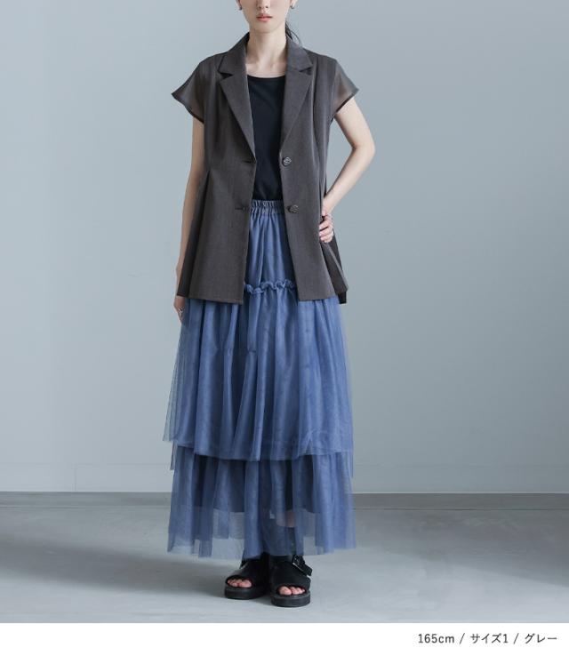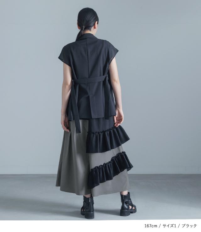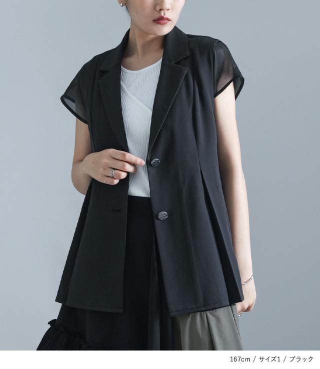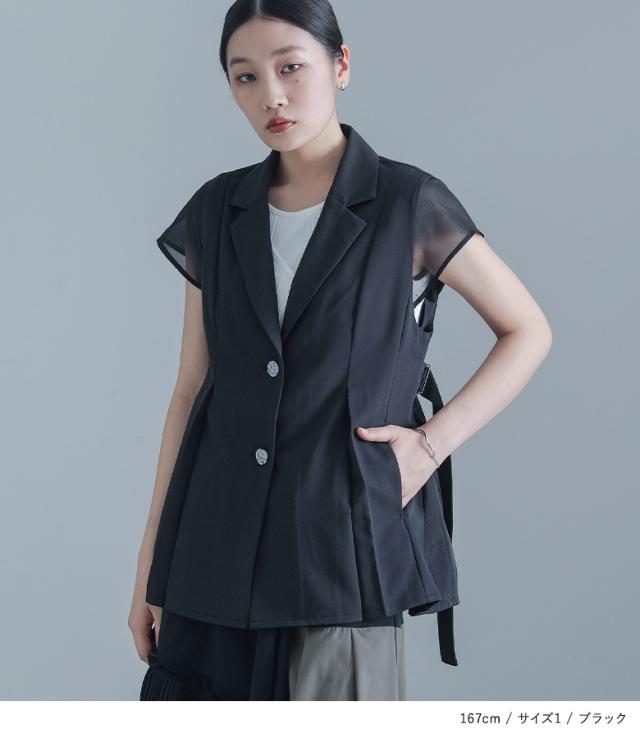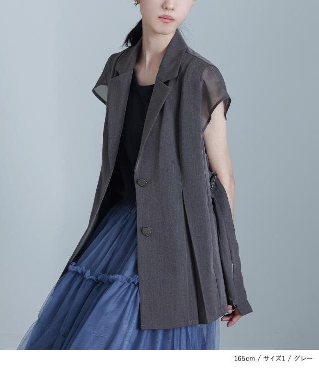 『シアー切替テーラードジレ』※メール便可※【10】[ジレ レディース ライトアウター アウター ベスト シアー 切り替え テーラード ベルト付き 異素材 羽織 モード 上品 春 秋 ロングシーズン]