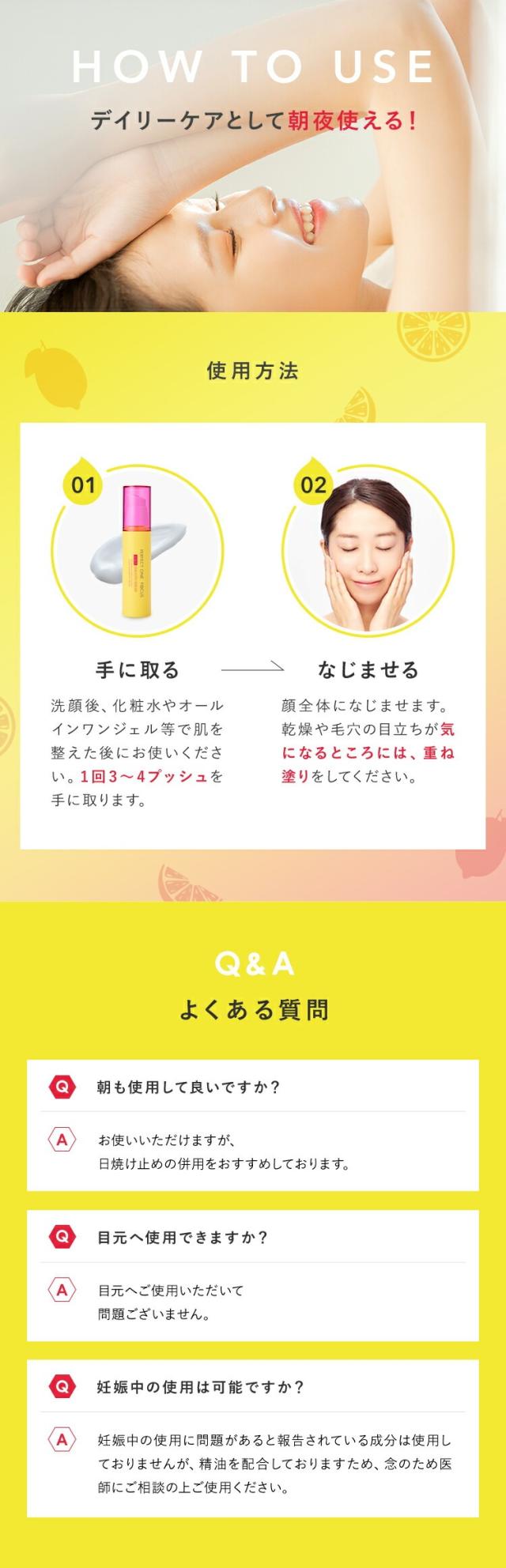水、グリセリン、BG、プロパンジオール、ホホバ種子油、ジグリセリン、スクワラン、(HDI/トリメチロールヘキシルラクトン)クロスポリマー、水溶性コラーゲン、加水分解コラーゲン、サクシノイルアテロコラーゲン、イソステアロイル加水分解コラーゲン、ミリスチル3−グリセリルアスコルビン酸、システイン/オリゴメリックプロアントシアニジン、イノシトール、キノア種子エキス、サルビアヒスパニカ種子油、バオバブ種子油、ブドウ種子油、マカデミア種子油、ハマメリス葉エキス、アーチチョーク葉エキス、マンダリンオレンジ果皮エキス、ベルガモット果実エキス、ニンジン根細胞培養溶解質、カニナバラ果実油、カリオデンドロンオリノセンセ種子油、クダモノトケイソウ果実エキス、オランダビユ果実エキス、リノール酸レチノール、バクチオール、パルミチン酸アスコルビルリン酸3Na、(アスコルビル/トコフェリル)リン酸K、ナイアシンアミド、セラミドNP、セラミドNG、セラミドAP、グレープフルーツ果実エキス、サンザシエキス、ナツメ果実エキス、リンゴ果実エキス、ライム果汁、オレンジ果汁、レモン果汁、ヒアルロン酸Na、ヒドロキシプロリン、ムラサキ根エキス、ローズマリー葉エキス、フラーレン、アルギニン、ポリ−γ−グルタミン酸Na、ポリグルタミン酸、ペンチレングリコール、プルラン、アセチルヒドロキシプロリン、アルギン酸Na、水添レシチン、カルボマー、ラウロイルグルタミン酸ジ(フィトステリル/オクチルドデシル)、シリカ、トコフェロール、トリ(カプリル酸/カプリン酸)グリセリル、イソステアリン酸、フィトステロールズ、ベヘニルアルコール、PVP、ヒドロキシエチルセルロース、キトサン、乳酸、セテアリルグルコシド、フェノキシエタノール、オレンジ果皮油、ベルガモット果実油
