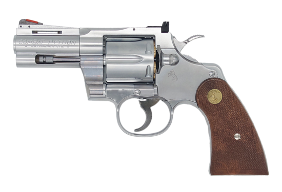 ステンレス製のパイソンを磨いて艶を出したアルティメット・ブライト・ステンレスモデルといったものも存在しますが、傷や汚れを気にせず.357マグナムが撃てる実用的なパイソンは保安官などにも人気がありました。
