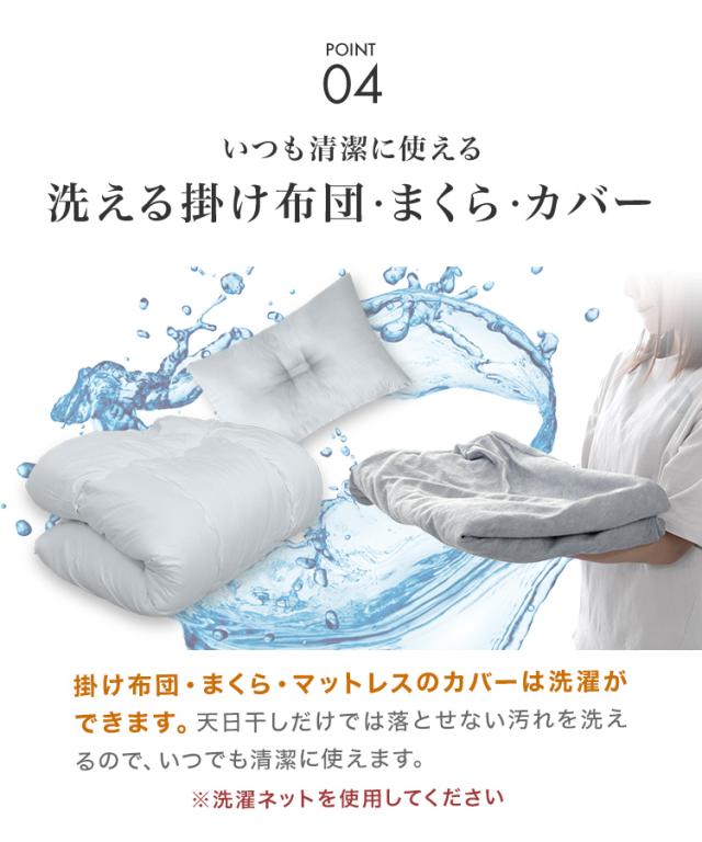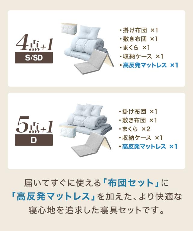 ・掛け布団 ・敷き布団 ・まくら ・収納ケース ・高反発マットレス ※本製品には、掛け布団カバー、敷き布団カバー、枕カバーは付属しておりません。別途ご用意ください。 |